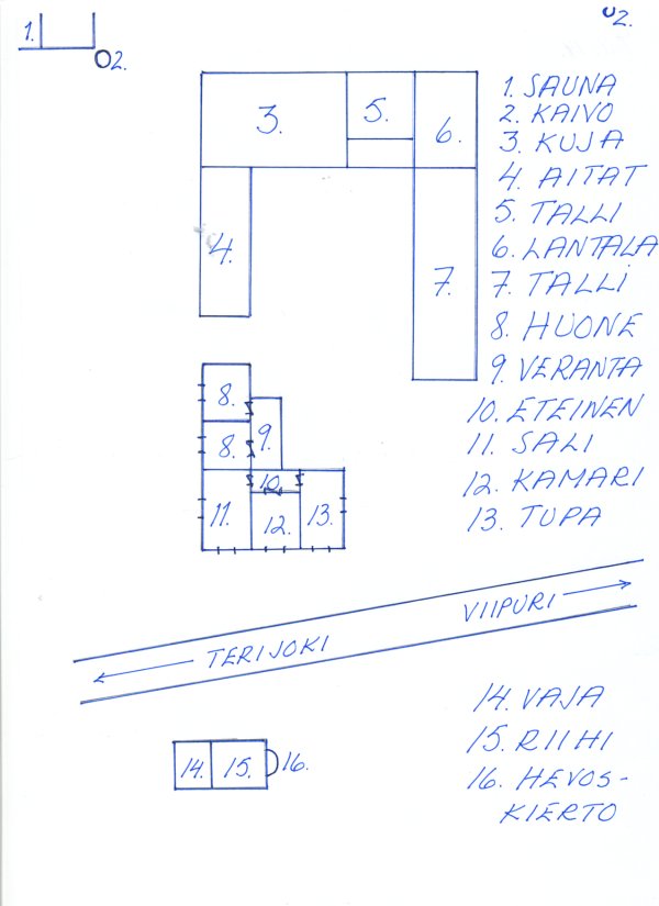 Tilan talousrakennus oli alapeltojen puolella Viipuri - Terijoki -maantien varrella. Maarekisterin mukaan tilan kokonaispinta-ala oli 27,48 hehtaaria. Siitä oli viljeltyä 5,65 hehtaaria, viljelyskelpoista maata 2,97 hehtaaria ja metsää 18,86 hehtaaria. Uunolla oli lisäksi maata Johanneksen Karhulassa. Talouskeskuksen rakennukset sijoittuivat oheisella Unto Hörkön laatimasta piirroksesta puhtaaksi piirretyllä tavalla. Asuinrakennus oli lautavuorattu ja väriltään rusehtava. Vuonna 1939 tilalla asuivat Uuno ja Maria Virenius, heidän tyttärensä Viola ja Uunon äiti Anna-Maria sekä Antton ja Ida Kesäläinen. Uuno kaatui talvisodassa. Muun perheen elämä kuitenkin jatkui ja Uunon ja Marian tyttären- tytär Tiina teki 1980-luvulla eräänlaista historiaa suomalaisen naiskauneuden saralla. Tiinasta nimittäin tuli Suomen ensimmäinen Playboyn keskiaukeamatyttö toukokuussa 1981.