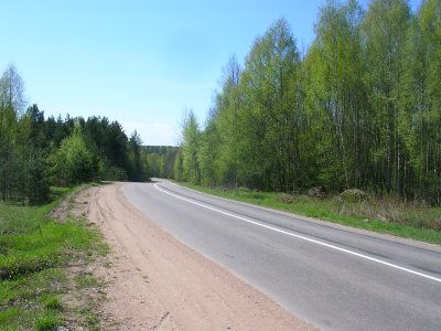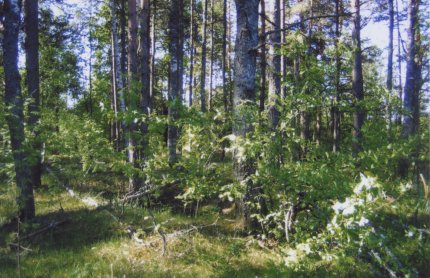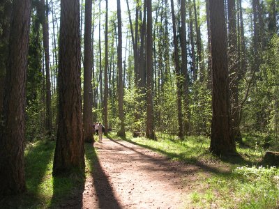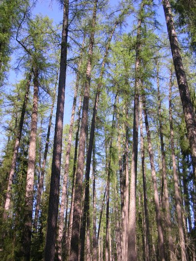 | Polku Raiviolan lehtikuusimetsässä. | Komeat lehtikuuset. |