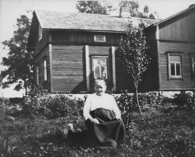 Paasonen: kuuluisa kansanparantaja Huumolan mummo. Taustalla Oskar Sutelan talo 30-luvulla. |