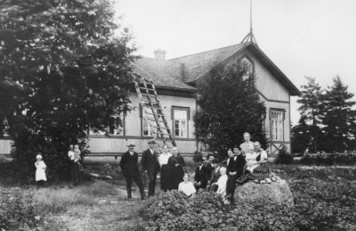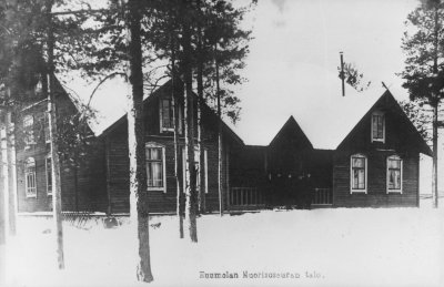 | Huumolan Nuorisoseuran laulukuoro kansakoulun edustalla. | Huumolan Nuorisoseuran talo. |