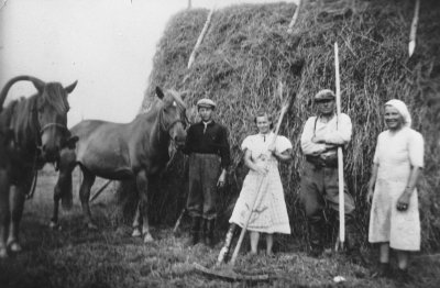 Heinäpielus Iivosen pellolla Huumolassa. Vas. Veikko Iivonen Hilma Piispanen, Uuno Iivonen ja Aino Iivonen. Kuva vuodelta 1942. |