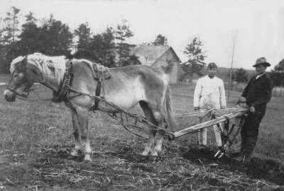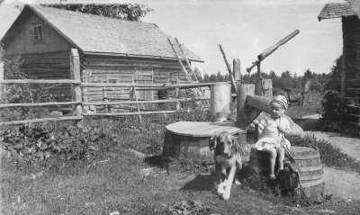 | August Iivonen kyntämässä, taustalla nuorisoseuran talo. | Sirkka Ahlberg ja Vili Karenin kaivolla 1920-luvun puolivälissä. |