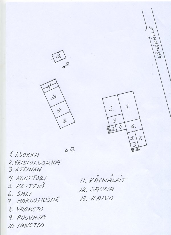 Terijoki -maantien risteystä. Tontin pinta-ala oli 1,27 ha. Rakennukset sijoittuivat oheisella Unto Hörkön muistikuvien perusteella laaditun piirroksen osoittamalla tavalla. Koululla oli puhelin, kutsu Huumola 7. Kaarina
